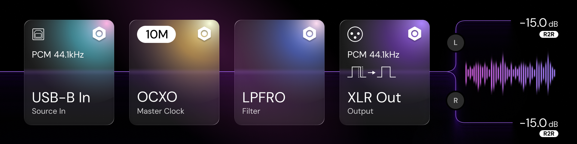 Na tomto rozhraní je zřetelně zobrazena cesta zvuku. Vstupní zdroje, hlavní hodiny, charakteristiky filtru, výstupy XLR/RCA a „tep“ dvoukanálového R2R řízení hlasitosti pro levý/pravý kanál — vše se přehledně rozvine a odhalí celý příběh vaší hudby.