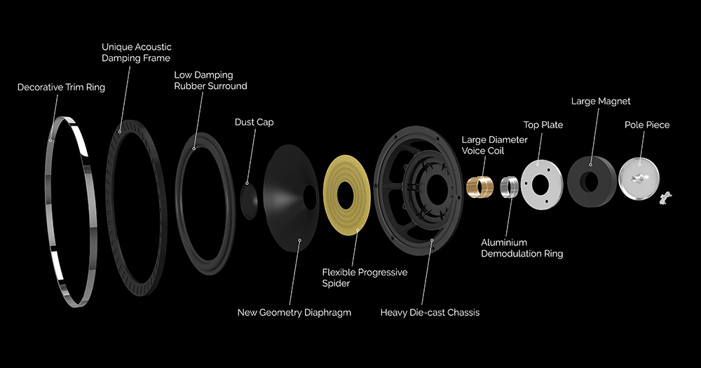 Energie pro pohon kužele pochází z 25mm, dvouvrstvé kmitací cívky, umístěné ve středové magnetické mezeře vybavené hliníkovým kroužkem, který kontroluje vířivé proudy, linearizuje indukci a tím zvyšuje šířku pásma a snižuje zkreslení. Celá sestava je namontována na hliníkovém koši s velkými větracími otvory pod pavoukem pro zlepšení přechodové odezvy.